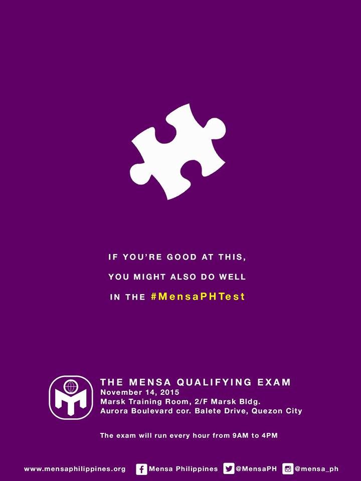 The next Mensa qualifying exam will be on November 14, 2015, Saturday, at